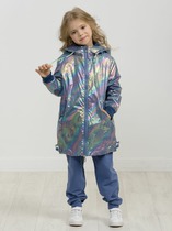 Плащ на тонком подкладе. Рекомендуемый температурный режим не ниже плюс 10 градусов. Ткань с голографическим водоотталкивающим покрытием. Прямой силуэт с регулировкой понизу эластиком со стоппером. Внутренний воротник и манжеты рукавов из рибаны. Оригинальная конструкция капюшона вместо классической утяжки по краю капюшона на шнур с фиксатором спроектирована специальная деталь держатель для декоративной тесьмы, которая регулирует объем капюшона по внешнему краю двойным эластиком с прозрачным наконечником. Световозвращающие элементы в боковых швах.