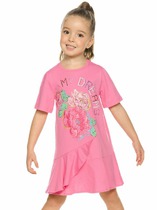 Платье для девочек из футера А силуэта. Аккуратный втачной рукав, небольшая горловина. Фишка декоративный асимметричный рельеф необычной округлой формы по переду и по спинке до низа изделия. В рельеф вставлен волан. Rubber принт с золотым металликом и глиттером. Надпись Чудеса случаются. Вуаля.