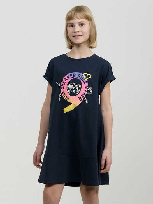 Платье трапециевидного оверсайз силуэта. Спущенная линия плеча, отворот рукава с закрепкой. По низу изделия отрезной волан. Стойкий неоновый принт. Перевод Тот, кто создает правила. Тот, кто нарушает правила.
