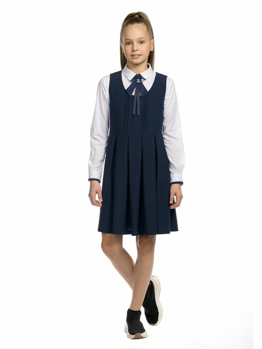 Сарафан для девочки в темно-синем цвете. Подойдет в качестве повседневного элемента школьной формы. Изделие соткано из двух частей, свободно сидит и не имеет застежки. Грудка декорирована вертикальными строчками, а в юбку заложено шесть складок, чтобы сделать изделие комфортным и свободным. Спинка цельная, книзу чуть расширяется, объем хорошо регулируется репсовой тесьмой, которую можно завязать на бант.