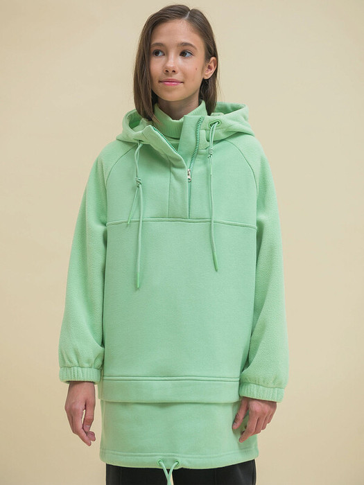 Худи для девочки удлинённое. Туника выполнена в сочетании двух материалов: футера с начёсом и мягкого флиса. Сочетание разных материалов в одном изделии —  один из главных трендов сезона. Капюшон и рукава из уютного флиса, перед и спинка — из тёплого футера с начесом. Худи детское модного оверсайз-силуэта с рукавами кроя реглан подарит ребёнку свободу движений и ощущение комфорта. Высокий воротник защищает шею от холода и ветра. Капюшон двухшовный, это обеспечивает анатомически правильную форму и комфортную посадку по голове. Объём капюшона регулируется декоративным двойным шнуром. В манжетах рукавов комфортная широкая резинка. Застежка спереди на короткую смещённую молнию под широкой планкой — актуальная, стильная деталь. По низу модели оригинальное членение с вшитой горизонтальной планкой — создаётся иллюзия многослойности, будто две вещи надеты одна поверх другой. Это модный тренд. Объем понизу регулируется деворативным шнуром. Худи однотонное, без принта. Неприхотливо в уходе. В составе основной ткани преобладает высококачественный хлопок — толстовка мягкая и дышащая. Благодаря полиэстеру  она легко стирается и быстро сохнет, не скатывается, не выгорает, сохраняет отличную форму надолго. Капюшон и рукава также выполнены из мягкого и практичного полиэстера. Худи зелёного цвета (трендовый оливковый оттенок). В линейке представлены следующие размеры: 2 (92), 3 (98); 4 (104); 5 (110); 6 (116); 7 (122); 8 (128); 9 (134); 10 (140); 11 (146). Худи с начёсом подходит для девочек дошкольного и младшего школьного возраста, а также девочек-подростков. Отличный вариант для детского сада, прогулок, активного отдыха, дома. Худи с капюшоном можно носить круглый год: прохладным летом, осенью и весной (демисезон), зимой. Чудесный подарок дочери, внучке или сестре на День рождения и любой другой праздник.