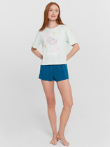 Комплект состоит из майки и шорт. Шорты полуприлегающие, короткие, на резинке. Майка прилегающего силуэта, с округлой горловиной. В верхней части спинки обработан фигурный вырез. Горловина, проймы, вырез на спинке обработаны бейкой из отделочного полотна.
