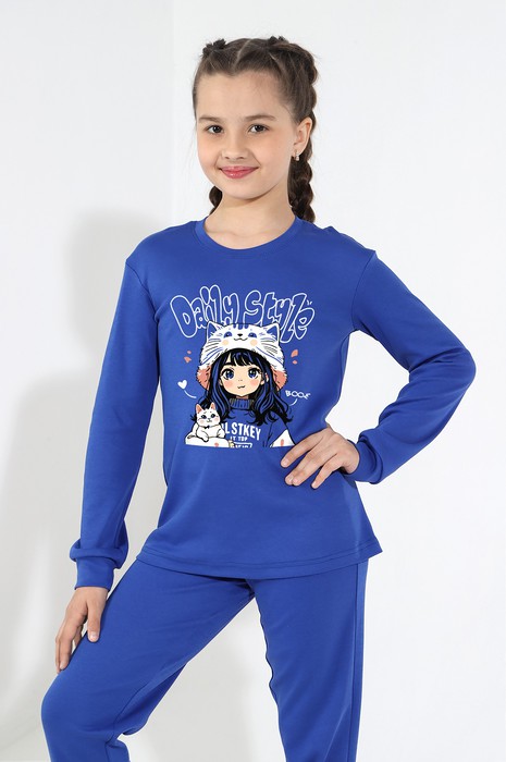 Пижама из интерлока для девочки, состоящая из джемпера и брюк. Джемпер со слегка спущенной линией плеч, с принтом на переде. Низ рукавов и брючек на манжетах.