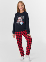 Пижама для девочки, состотящая из блузы и шорт. Блуза пижамная - из гладкокрашенного полотна "кулирка", свободжного покроя, с короткими цельнокроеными рукавами, V-образной горловиной и центральной бортовой застежкой на обметанные петли и пуговицы. В верпхней части левой полочки - принт, выполненный в технике шнлкографии. Борта и горловина окантованы основным материалом. Шорты - из полотна "кулирка" в клетку, расклешеные, короткие, с эластичной тесьмой по талии.