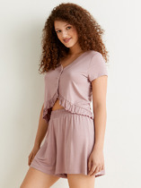 Пижама молодежная из гладкокрашеного трикотажного вискозного полотна, состоящая из топа и шорт. Топ - на узких бретелях, полочка – с лифом «бюстье», отделанным кружевом, в центре лифа – разрез, окантованный основным материалом. Основная деталь переда присборена по шву соединения с лифом. Верхний срез спинки и проймы окантованы основным материалом, бретели вытачаны из окантовки.Шорты – средней длины, с эластичной тесьмой по талии.