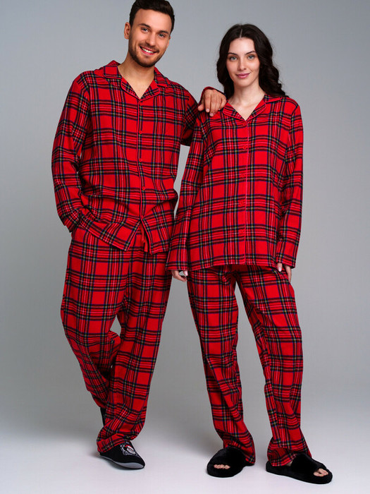 Пижама текстильная взрослых размеров: можно составить family look c детским вариантом пижамы аналогичного дизайна. 100% хлопок. Фланель - мягкая, приятная к телу ткань с небольшим начесом. Застежка на пуговицы. Карманы в брюках. Эластичный пояс с тесьмой позволяет легко надевать брюки и утягивать до комфортной посадки.