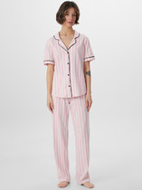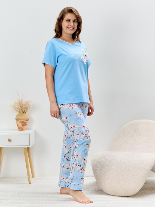 Пижама женская из трикотажного полотна «кулирка» в комбинации двух видов полотен: с набивным рисунком и гладкокрашенного в единой цветовой гамме, состоящая из футболки и брюк. Футболка - из гладкокрашенного полотна, классического покроя, с короткими втачными рукавами, горловиной овальной формы и принтом на полочке, выполненным в технике «шелкографии». Горловина, низ рукавов обработаны узким притачным кантом контрастного цвета.Брюки - длинные, с эластичной тесьмой по талии и притачными манжетами, которые обработаны с узким кантом контрастного цвета в соединительных швах.