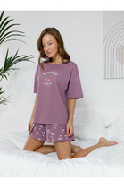 Пижама женская, состотящая из блузы и шорт. Блуза пижамная - из полотна "кулирка" в клетку, свободжного покроя, с короткими цельнокроеными рукавами, V-образной горловиной и центральной бортовой застежкой на обметанные петли и пуговицы. Борта и горловина окантованы основным материалом. Шорты - из полотна "кулирка" в клетку, расклешеные, короткие, с эластичной тесьмой по талии.