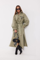 Стильный плащ от бренда D'imma fashion studio коллекции весна/лето 2016, выполненный из гладкого нейлона с орнаментом, на шелковистой подкладке. Плащ свободного кроя, с отложным воротником, боковыми карманами и необычной складкой на спине. Спереди плащ застегивается на пуговицы.