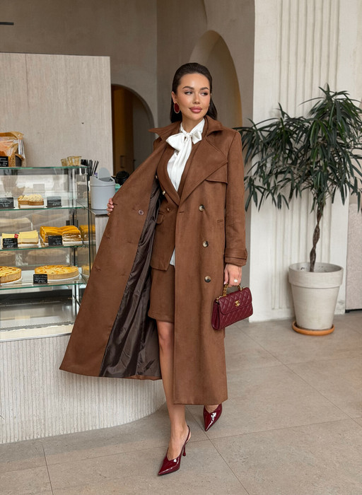 Тренч женский демисезонный, двубортный, удлинённого прямого силуэта, из замшевой ткани, на подкладке, двубортный, со съемным поясом из основной ткани и шлёвками. Плащ предназначен для повседневной носки.