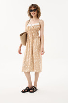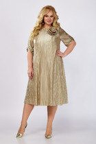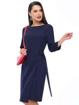 Платье приталенного фасона. На талии установлены шлефки на пуговицах, в который продет пояс. Короткий рукав, отложной воротник. Рукава декорированы патами. Застегивается на пуговицы. В области груди имитация карманов. По бокам накладные карманы.