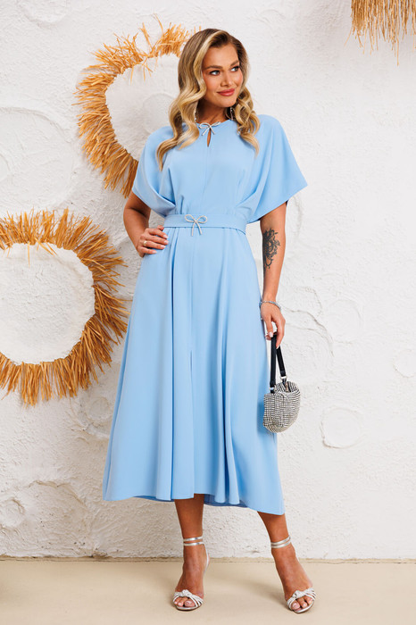 Элегантное нарядное платье, выполнено из роскошной струящейся плательной ткани с добавлением вискозы. Платье с округлой горловиной и вырезом капелькой, украшенной тесьмой в виде бантика. Платье отрезное по линии талии, верхняя часть платья выполнена в свободном стиле со спущенной линией плеча и глубокими складками на линии талии, что придает платью особый стиль и шарм. Юбка платья с расклешением, по переду с разрезом. В центральном шве платья потайная молния застежка. Рукав цельнокроеный, объёмный, со спущенной линией плеча. В комплекте к платью идет съемный пояс, украшенный тесьмой в виде бантика, по спинке с застёжкой на пуговицы. Модель удобная и практичная, вы будете в нем выглядеть неотразимо и нарядно.