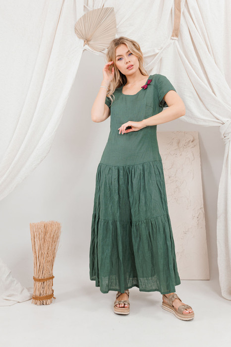 Льняное натуральное платье с двумя  воланами. На груди сьемная красивая вышивка-брошь.