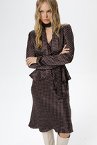 Натуральное платье с дизайнерской вышивкой у горловины. Спика имеет средний шов, застежку на тесьму-молнию, талиевые выточки и разрезик.