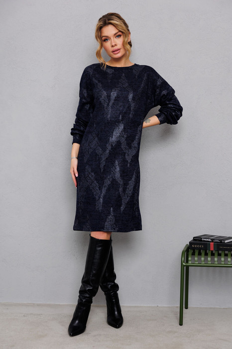 Платье из очень эффектного трикотажа с лёгким блеском. Впечатляют красотой объёмные рукава на манжете. Изделие без подкладки и без застёжки.