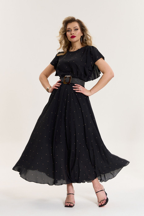 Элегантное платье женское из шифоновой ткани, отрезное по линии талии, на резинке. По полочке и спинке идут вертикальные подрезы с воланами. К платью идет съемный пояс. Юбка фасона "солнце". Съемный пояс в комплекте. Длина спинки -42см, длина юбки -100см