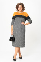 Полочка платья с вертикальными рельефами в верхней части и с отрезной боковой нижней частью, на которой выполнены карманы и складки в шве по талии. Застежка двубортная, на петлю и пуговицу. Горловина V-образной формы, обработана воротником типа “апаш” из отделочной ткани. Спинка со средним швом и вертикальными рельефами. Рукав длинной 3/4, втачной, двухшовный, с отделкой по краю.