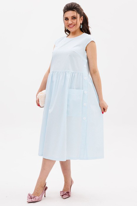 Отрезной крой по талии деликатно подчеркивает силуэт, а декоративные петли с пуговицами по бокам придают платью изящную деталь, делая его интереснее. Воздушная миди-длина удобна для прогулок и отдыха, а натуральная ткань позволяет коже дышать даже в самый теплый день.