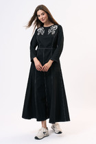 Платье с кружевными вставками по рукаву. Выполнено из оригинального принтованного полотна. Прямой силуэт, втачной рукав, рубашечный воротник на стойке, функциональная застёжка на пуговицы по всей длине. Особенностью и украшением платья являются рукава, в верхней части которых вставлена сетка.