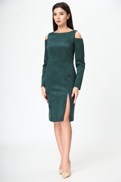 Полуприлегающий силуэт с открытой линией плеча.Отрезное по линии талии.Элегантный вырез горловины лодочкой.Кокетки по переду и спинке.Коструктивные линии талевых и нагрудных вытачек,рельефов.В левом рельефе нижней части платья разрез.