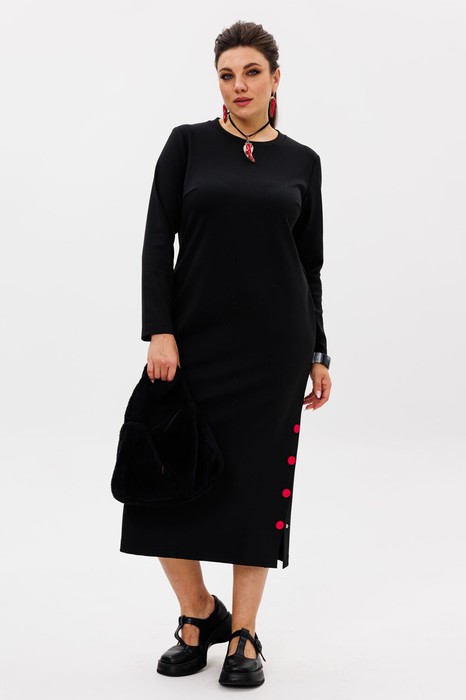 Особенность модели — стильная шлица на кнопках, расположенная сбоку, которая не только добавляет оригинальности, но и позволяет варьировать образ: расстегнув несколько кнопок, можно создать лёгкий, игривый акцент. В боковых швах предусмотрены карманы, что делает платье ещё более практичным и удобным.