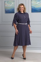 Платье полуприлегающего силуэта. Перед и спинка с рельефами, переходящие в талевую вытачку. Особенность этого нарядного платья – рукав-пелерина, вшитый в рельефы переда и спинки, который широко использовал в своих коллекциях Пьер Карден. Завершает образ подчёркивающий фигуру завязывающийся пояс выше линии талии. Платье выполнено на подкладке.