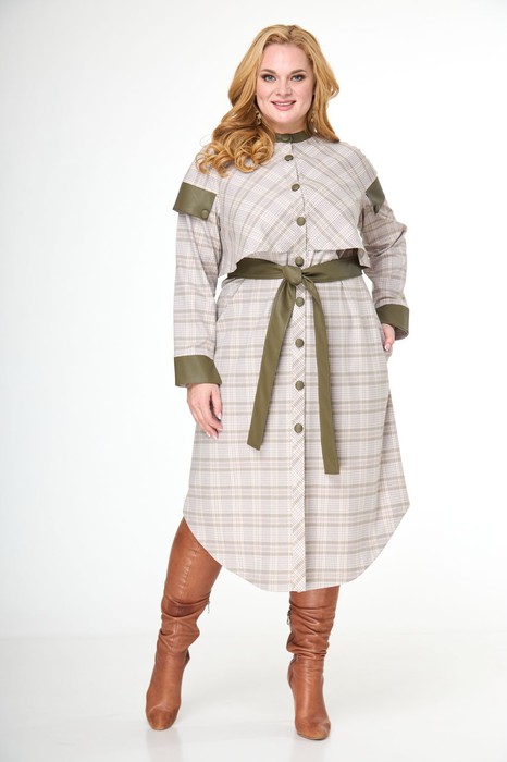 Модель платья относится к актуальному стилю «милитари»,демонстрируя уверенный и целеустремлённый образ. Характерные детали по рукавам из экокожи, воротник-стойка, отлетные кокетки по переду и спинке, функциональные карманы в боковых швах, съёмный пояс из экокожи, фигурный низ-особенности этой модели платья.