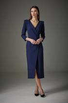 Платье А-силуэта длиной макси. Воротник рубашечного типа - отложной на отрезной стойке. По переду расположена центральная застежка на кнопки. Спинка со средним швом. В боковых швах обработаны функциональные карманы. Рукав втачной прямой длинный, со спущенной линией плеча, по низу на манжете с застежкой на кнопки.
