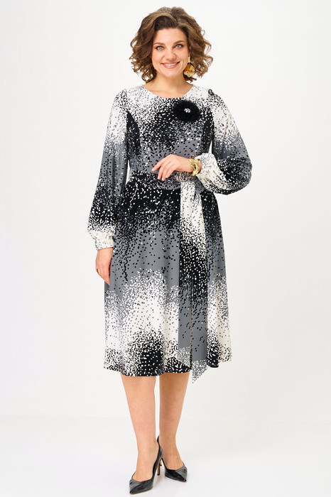 Платье полуприлегающего силуэта, длиной миди, отрезное по линии талии. Горловина округлой формы, обработана обтачкой. Перед лифа с рельефными швами, по спинке - талиевые вытачки. Застежка на молнию в боковом шве. Юбка платья - "полусолнце", расклешенная книзу, с функциональными карманами в боковых швах. Рукав втачной прямой, длинный, по низу — манжет на резинке. В комплекте к платью прилагаются съемное украшение-брошь и пояс, который поможет создать акцент на талии.