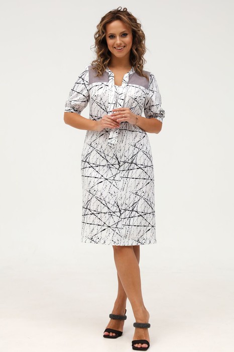 Платье полуприлегающего силуэта. Горловина платья округлой формы, обработана широкой обтачкой, переходящей по переду в завязки, имитирующее галстук. Перед с нагрудными вытачками, в верхней части расположена кокетка из сетки. Спинка с талиевыми вытачками и застежкой молнией от горловины в среднем шве. Рукав короткий втачной, по низу - замкнутая манжета со сборкой.