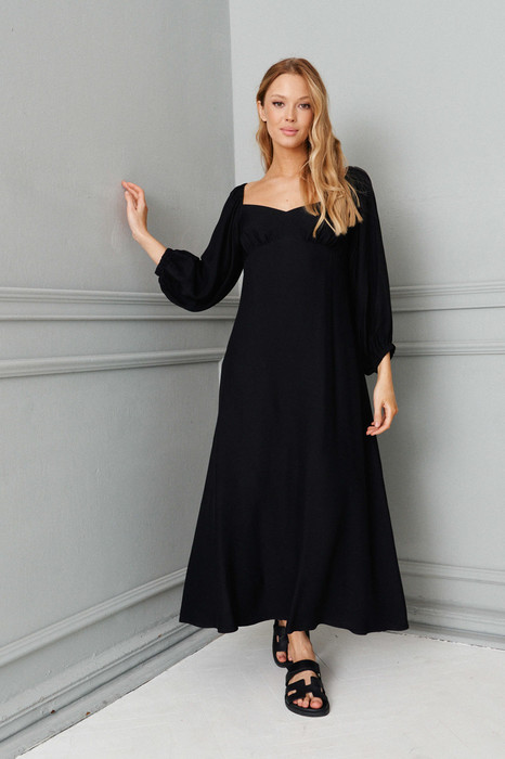 Платье полуприлегающего силуэта выполнено из полотначерного цвета. Фасон изделия, классический цвет сделаетВаш образ нежным и женственным.Характеристики: отрезное выше линии талии, подкладка,фигурный вырез горловины, рукав объёмный, по верху и понизу рукава резинка, юбка в изделии свободного кроя. Спинкачастично выполнена резинкой со сборкой. Длина 127 см,длина рукава 54 см.