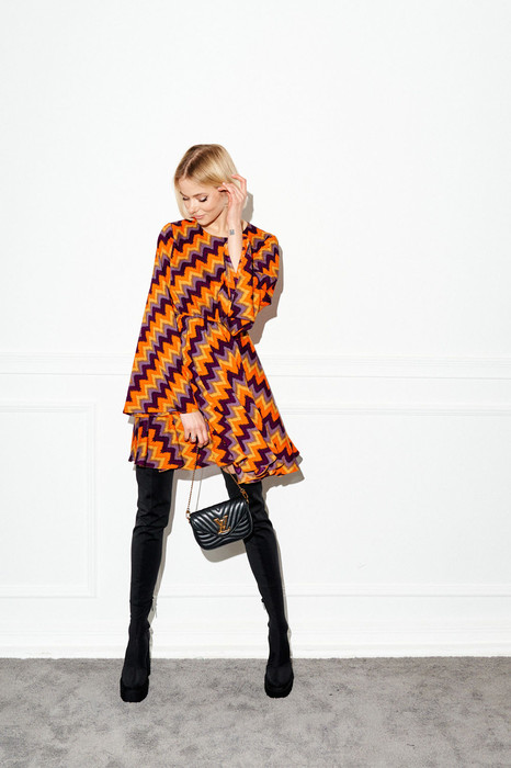 Миниатюрное платье полуприлегающего силуэта выполнено из полотна с абстрактным принтом. Легкое, акцентное платье идеально для каждодневного образа на офис, на учебу, на встречу.Характеристики: полуприлегающий силуэт, подкладка, отрезное, отрез на резинке, V образный вырез горловины, рукав втачной, застежка петля пуговичка по спинке изделия. Длина 91 см, длина рукава 70 см