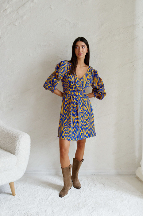 Платье полуприлегающего силуэта выполнено из полотна с абстрактным контрастным принятом. Характеристики: прилегающий силуэт, подкладка, отрезное, по отрезу фигурная вставка со сборкой, горловина V образный вырез, по переду изделия не функциональные пуговички, рукав втачной по низу рукава манжета на резинке, по спинке в области фигурной вставки - резинка венгерка, низ в изделии свободного кроя на подкладке. Длина изделия по спинке 90 см, длина рукава 57 см.