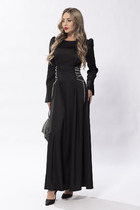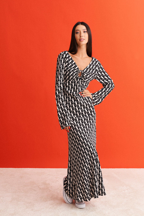 Элегантное платье прилегающего силуэта выполнено из полотна с контрастным геометрическим принтом. Характеристики: V образный вырез горловины с декоративным разрезом на кулиске, отрезное выше линии талии, отрез фигурный, спинка - V образный вырез , рукав втачной с разведением к низу. Длина от верхнего края плеча 144 см, длина рукава 70 см.