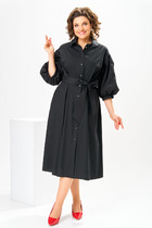 Платье полуприлегающего силуэта выполнено из черного полотна с принтом горох. Характеристики: полуприлегающий силуэт, отрезное, по отрезу фигурная вставка, по спинке отрез на резинке, воротник отложной, застежка центральная на петли пуговички, рукав свободного кроя, юбка в изделии свободного кроя с подъюбником. Длина по спинке 86, длина рукава 77 см.
