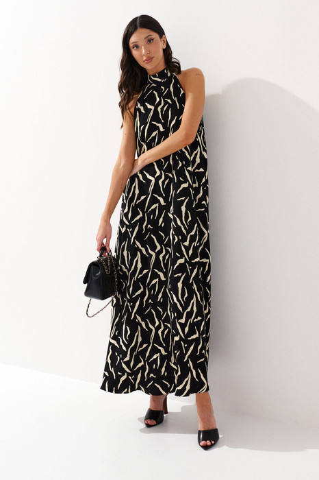 Платье полуприлегающего силуэта выполнено из черного полотна с контрастным принтом. Характеристики: полуприлегающий А-образный силуэт, подкладка, горловина стойка, широкая пройма, застежка потайная тесьма молния в среднем шве заднего полотна изделия.