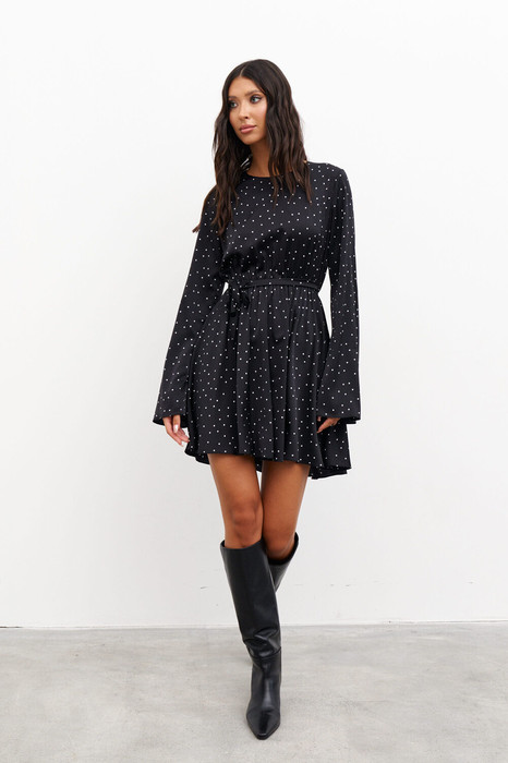 Миниатюрное платье полуприлегающего силуэта с открытой спинкой, выполнено из плательной ткани в горошек . Характеристики: полуприлегающий силуэт, открытая спинка, по талии изделия идет резинка, рукав к низу свободного кроя, по бокам платья нашиты завязки из ткани основного изделия, овальная горловина, рукав втачной, по горловине спинки завязка на кулиску, низ платья на трикотажной подкладке. Длина по спинке 87 см длина рукава 67 см.
