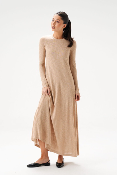 Комплект состоит из двух платьев: платье на бретелях и платья полуприлегающего силуэта. Выполнен из полупрозрачного трикотажного полотна песочного цвета. Характеристики:нижнее платье полуприлегающего силуэта, А-образный силуэт, бретели - не регулируемые. Длина по спинке 64 см. Верхнее платье полуприлегающего силуэта, А-образный силуэт, горловина овальная, рукав втачной. Длина по спинке 130 см, длина рукава 62 см.