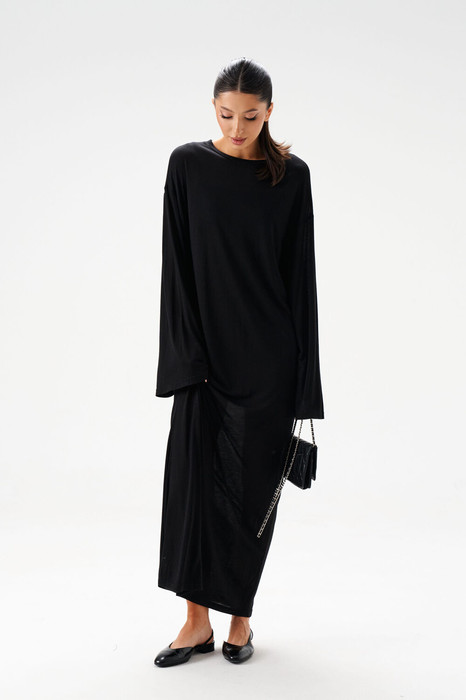 Комплект состоит из двух платьев: платье на бретелях и платье прямого свободного кроя. Выполнен из полупрозрачного трикотажного полотна белого цвета. Характеристики:нижнее платье полуприлегающего силуэта, А-образный силуэт, бретели - не регулируемые. Длина по спинке 65 см. Верхнее платье прямого свободного кроя, горловина овальная, рукав спущен. Длина по спинке от края горловины 131 см, длина рукава от края горловины 75 см.