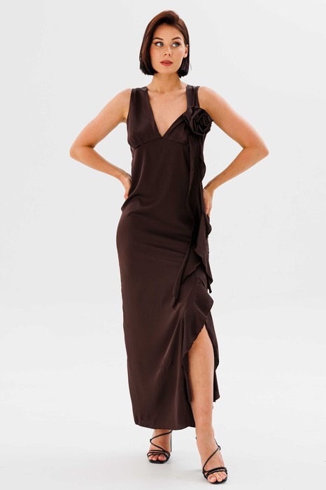 Платье в длине миди, выполнено из шелка армани, лиф отрезной, по переду сбоку обработан вырез с воланом. Застежка - потаная молния в боковом шве. Декор в виде цветка с воланами отстегивается.