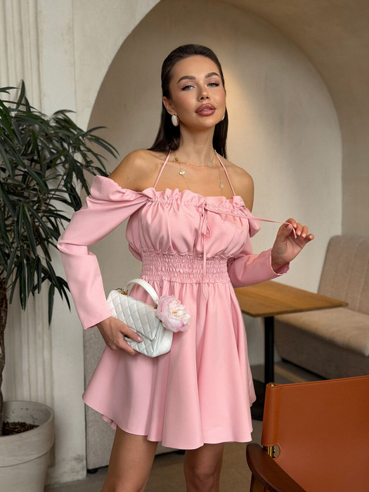 Женственное платье из  текстильной кани с широкой юбкой по форме солнце. Подчеркнутая линия груди в виде чашечек с изящными сборками. Рукава . Застежка собраны на резинку, можно носить на плече и на предплечье. Платье подчеркивает талию  за счет резинки в области талии. Длина мини. Идеальный вариант для свидания и особых случаев.