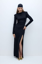 Женское платье полуприлегающего силуэта выполнено из однотонной плательно-костюмной ткани. Перед с подрезам ниже линии талии.Верхняя часть переда со средним швом и нагрудными вытачками из горловины.Нижняя часть переда с вертикальными карманами с листочками и клапанами с декоративными пуговицами. Спинка со средним швом и вытачками из горловины. Рукава втачные двухшовные длиной 3/4. Горловина с цельнокроеной стойкой и каплей по переду. Низ платья фигурный с разрезами по бокам.