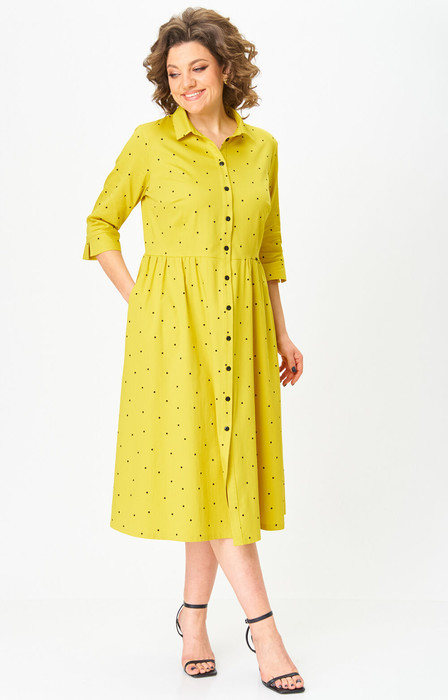 Платье женское, повседневное, полуприлегающего силуэта, отрезное по линии талии, длиной ниже линии колен, из хлопковой ткани. Перед с застежкой на пуговицы. Вырез горловины обработан воротником на стойке. Рукав втачной, по низу обработан цельнокроенной манжетой. Длина по спинке 117 см, длина рукава 16,5 см.