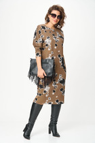 Платье женское полуприлегающего силуэта, двухцветное. Застежка центрально-бортовая на петли и пуговицы, на талии кулиска. Нижняя часть платья на подкладке, перед полочки украшен декоративной розой.