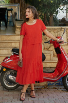 Шармила – элегантное платье свободного кроя из жатой плательной ткани. Рукава втачные, короткие. Вырез горловины – фигурный, с которым великолепно сочетаются различные украшения. По низу – волан, который отлично скрывает недостатки фигуры и придает платью нарядность.