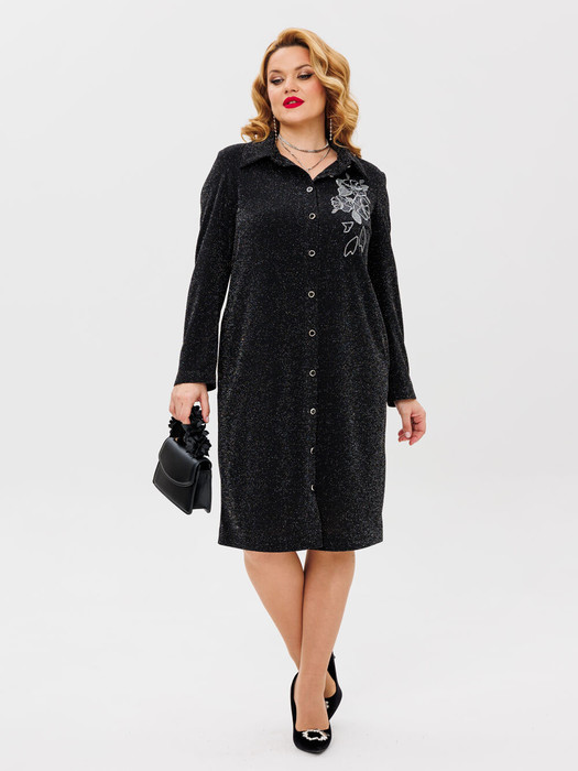 Нарядное  платье из мягкой, эластичной ткани с люриксом, люрикс не колется.  Платья полуприлегающего силуэта по переду планка с элегантными пуговицами, классический воротник, в боковых швах расположены карманы, акцент сделан на авторскую вышивку. Спинка лаконичная. Рукава длинные. Отличный вариант для торжества, корпоративов, встреч с друзьями.