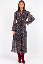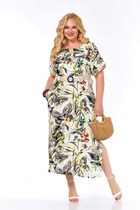 Платье А-силуэта, отрезное по линии талии с рюшей. Втачной длинный рукав со сборкой по окату и внизу на резинке. По переду лиф с центральной застежкой на петли-пуговицы. Полочка и спинка с притачными слегка присборенным воланом с рюшей из основной ткани и воланом из отделочной ткани по низу платья. Воротник стойка с рюшей. Платье на подкладке.