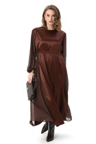 Платье миди, силуэт полуприлегающий в верхней части, переходящий в расклешенный А-силуэт к низу, создающий эффект удлиненной и струящейся фигуры. Воротник широкий, плоский, отложной, с закругленными краями. Лиф с застежкой на петли пуговицы. Декоративный ряд контрастных пуговиц, подчеркивает V-образный вырез и утончает силуэт. Для лучшего прилегания в платье выполнены нагрудные выточки и выточки по спинке, для большего удобства обработаны карманы-хулиганы. Рукава длинные, втачные, с легкой сборкой на манжетах, что добавляет мягкости и женственности. По полочке  и спинке идет подрез чуть ниже линии талии, от которого по полочке юбки выполнена встречная складка. Длина изделия по спинке 120 см., длина рукава 62 см.