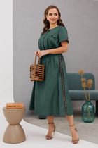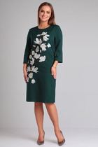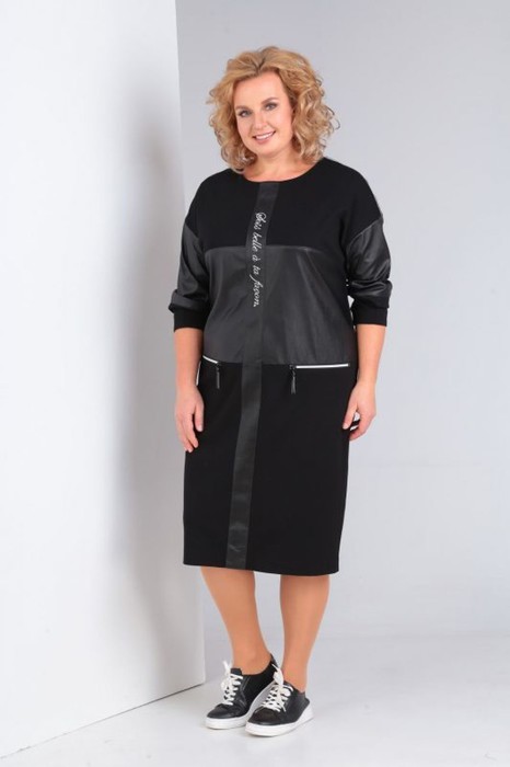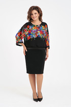 Платье женское полуприлегающего силуэта .Спинка со средним швом и разрезом по низу.Перед с кокеткой и подрезом чуть ниже талии ,в котором обработаны карманы с молнией. По центру переда лампас из отделочной ткани с вышивкой .Рукав втачной со спущенной линией плеча состоит из трёх частей: средняя часть рукава и средняя часть переда из отделочной ткани (кож.зам.),нижняя деталь рукава с двумя вытачками.Горловина округлая .По плечевым швам настрочена отделочная тесьма.