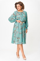 Платье женское свободного кроя чуть зауженное к низу. Платье выполнено из ткани четырёх разных оттенков. Перед с тремя косыми подрезами. Спинка с тремя подрезами и средним швом в нижней части , в котором обработан разрез.Рукав цельнокроеный. Горловина округлой формы. В качестве отделки используется нашивка.